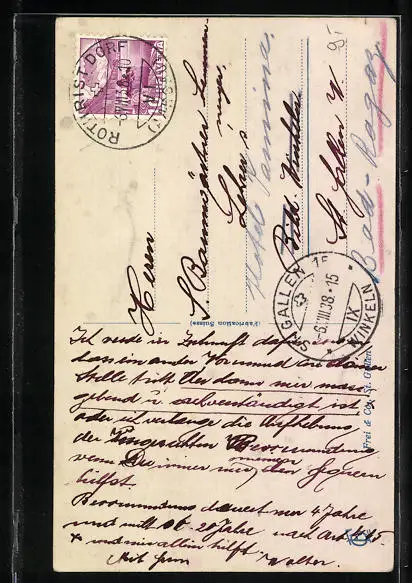 Personenbezogene Daten auf der Rückseite der Karte wurden durch blauen Textmarker unkenntlich gemacht. Die blauen Stellen sind auf die Vorderseite durchgeweicht und wirken sich negativ auf das Postkartenfoto aus