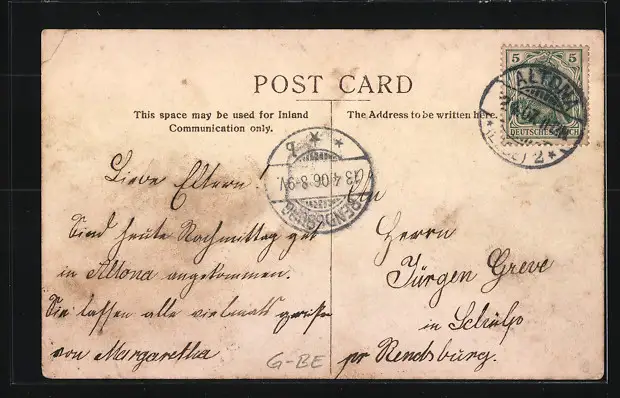 Personenbezogene Daten auf der Rückseite der Karte wurden durch blauen Textmarker unkenntlich gemacht. Die blauen Stellen sind auf die Vorderseite durchgeweicht und wirken sich negativ auf das Postkartenfoto aus
