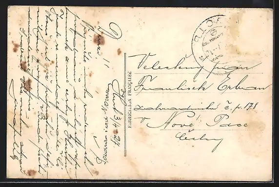 Personenbezogene Daten auf der Rückseite der Karte wurden durch blauen Textmarker unkenntlich gemacht. Die blauen Stellen sind auf die Vorderseite durchgeweicht und wirken sich negativ auf das Postkartenfoto aus