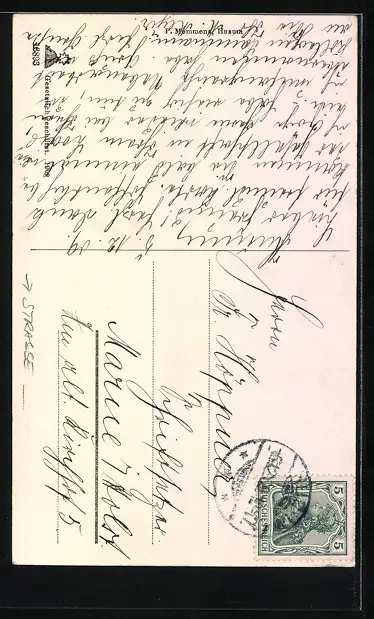 Personenbezogene Daten auf der Rückseite der Karte wurden durch blauen Textmarker unkenntlich gemacht. Die blauen Stellen sind auf die Vorderseite durchgeweicht und wirken sich negativ auf das Postkartenfoto aus