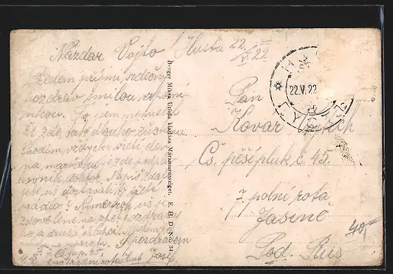 gelaufen 1922, Briefmarke entfernt, Eckknicke u. Abriebspuren oben re. u. unten li., guter Zustand