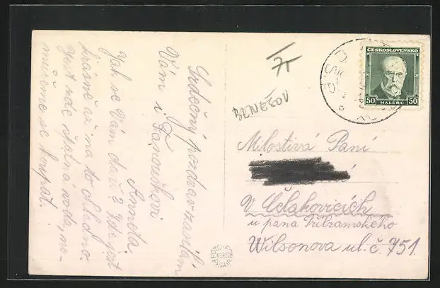 Personenbezogene Daten auf der Rückseite der Karte wurden durch blauen Textmarker unkenntlich gemacht. Die blauen Stellen sind auf die Vorderseite durchgeweicht und wirken sich negativ auf das Postkartenfoto aus