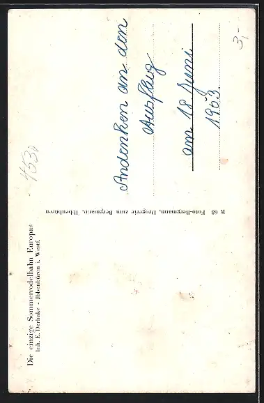 Personenbezogene Daten auf der Rückseite der Karte wurden durch blauen Textmarker unkenntlich gemacht. Die blauen Stellen sind auf die Vorderseite durchgeweicht und wirken sich negativ auf das Postkartenfoto aus