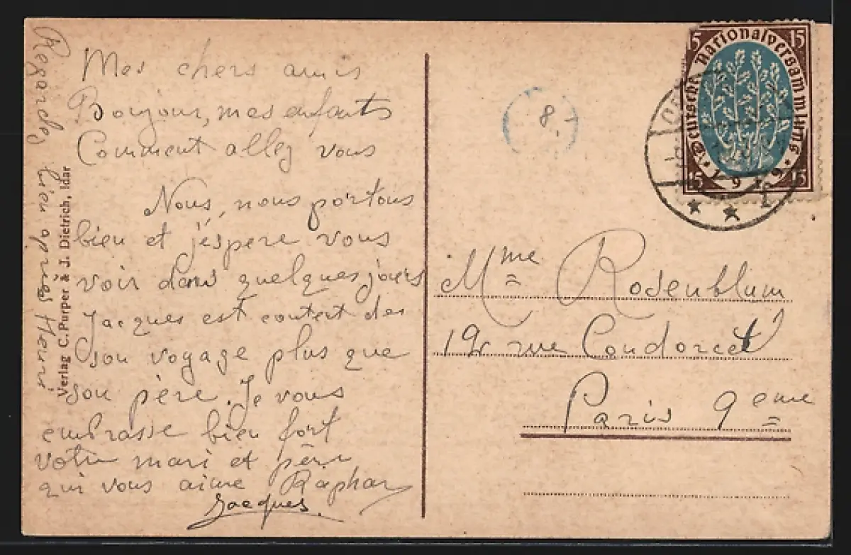 Personenbezogene Daten auf der Rückseite der Karte wurden durch blauen Textmarker unkenntlich gemacht. Die blauen Stellen sind auf die Vorderseite durchgeweicht und wirken sich negativ auf das Postkartenfoto aus