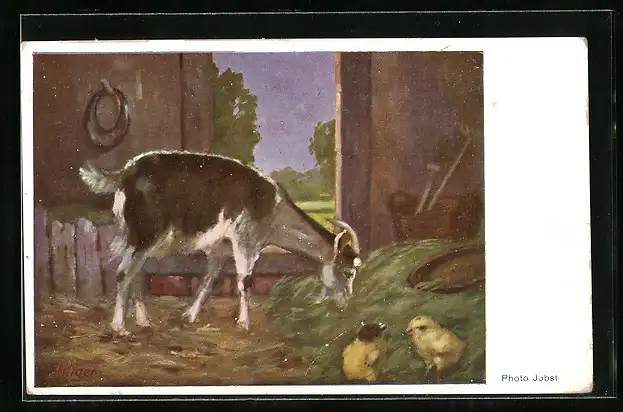 AK Idyll, eine Ziege und zwei Küken in einem Stall