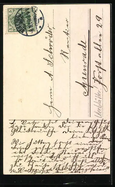 Personenbezogene Daten auf der Rückseite der Karte wurden durch blauen Textmarker unkenntlich gemacht. Die blauen Stellen sind auf die Vorderseite durchgeweicht und wirken sich negativ auf das Postkartenfoto aus