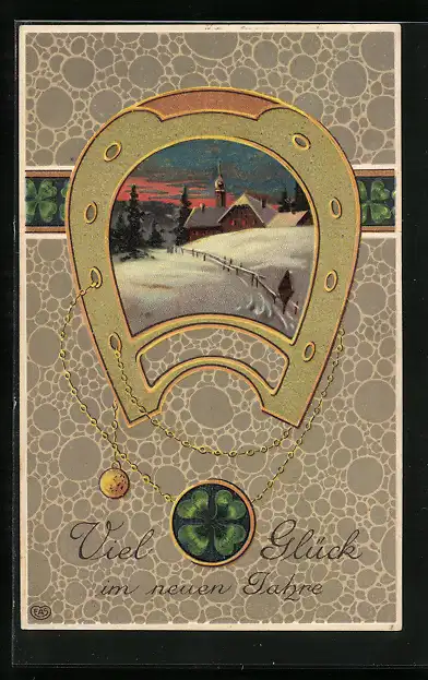 AK Idyllische Winterlandschaft im Hufeisen-Passepartout mit Kleeblatt