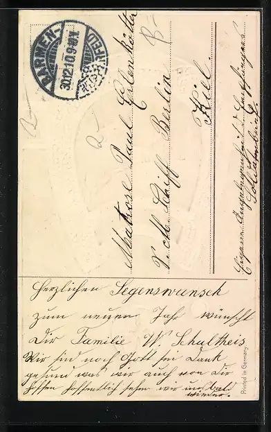 Personenbezogene Daten auf der Rückseite der Karte wurden durch blauen Textmarker unkenntlich gemacht. Die blauen Stellen sind auf die Vorderseite durchgeweicht und wirken sich negativ auf das Postkartenfoto aus