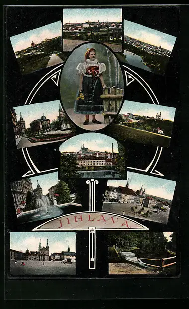 AK Iglau, Brunnen, Wasserfall, Frau in Tracht