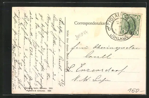 Personenbezogene Daten auf der Rückseite der Karte wurden durch blauen Textmarker unkenntlich gemacht. Die blauen Stellen sind auf die Vorderseite durchgeweicht und wirken sich negativ auf das Postkartenfoto aus