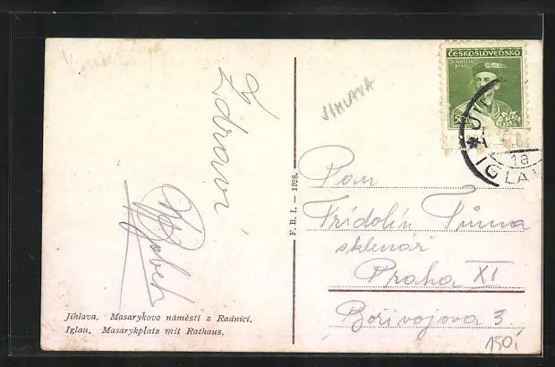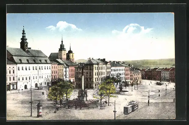 AK Iglau, Masarykplatz mit Rathaus und Strassenbahn