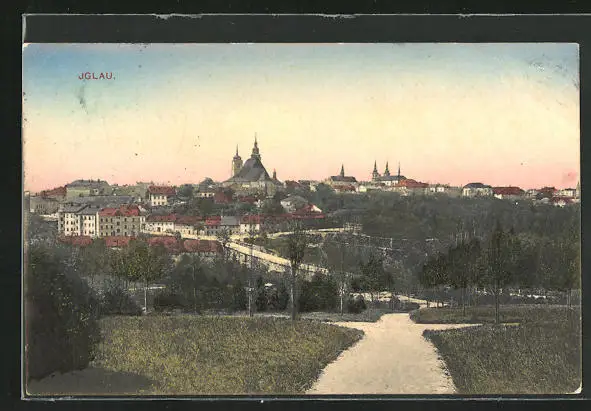 AK Iglau, Strassenpartie im Parkt am Rande des Ortes