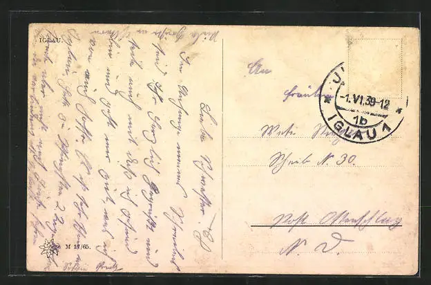 gelaufen 1939, Briefmarke entfernt, Bugspur, sonst guter Zustand