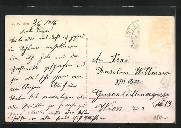 alte Ansichtskarte, gelaufen 1916, Briefmarke entfernt, rückseitig Oberflächenschaden, Stempelspur, guter Zustand