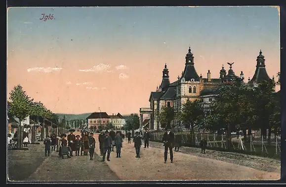 AK Igló, Belebte Strassenpartie vor herrschaftlichem Gebäude