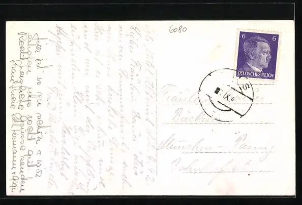 Personenbezogene Daten auf der Rückseite der Karte wurden durch blauen Textmarker unkenntlich gemacht. Die blauen Stellen sind auf die Vorderseite durchgeweicht und wirken sich negativ auf das Postkartenfoto aus