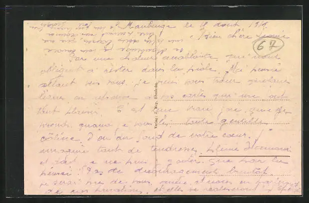 Personenbezogene Daten auf der Rückseite der Karte wurden durch blauen Textmarker unkenntlich gemacht. Die blauen Stellen sind auf die Vorderseite durchgeweicht und wirken sich negativ auf das Postkartenfoto aus