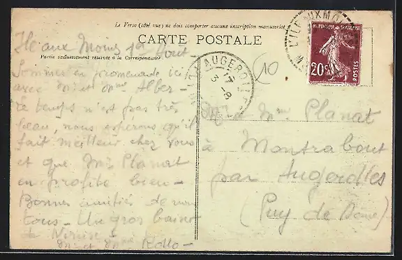 Personenbezogene Daten auf der Rückseite der Karte wurden durch blauen Textmarker unkenntlich gemacht. Die blauen Stellen sind auf die Vorderseite durchgeweicht und wirken sich negativ auf das Postkartenfoto aus