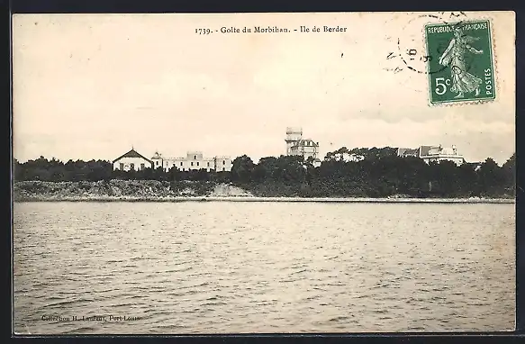 AK Île de Berder, Vue sur les bâtiments de l`île depuis la mer