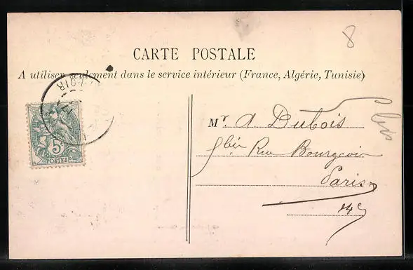 Personenbezogene Daten auf der Rückseite der Karte wurden durch blauen Textmarker unkenntlich gemacht. Die blauen Stellen sind auf die Vorderseite durchgeweicht und wirken sich negativ auf das Postkartenfoto aus