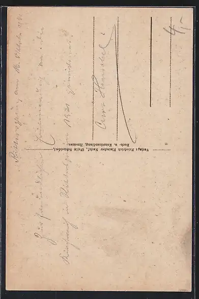 Personenbezogene Daten auf der Rückseite der Karte wurden durch blauen Textmarker unkenntlich gemacht. Die blauen Stellen sind auf die Vorderseite durchgeweicht und wirken sich negativ auf das Postkartenfoto aus