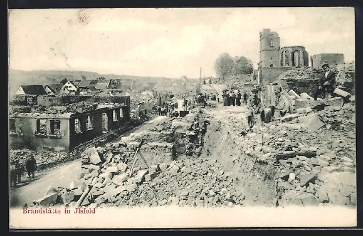 AK Ilsfeld, Blick über die Brandstätte, Leute in den Ruinen
