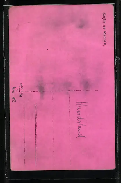 Personenbezogene Daten auf der Rückseite der Karte wurden durch blauen Textmarker unkenntlich gemacht. Die blauen Stellen sind auf die Vorderseite durchgeweicht und wirken sich negativ auf das Postkartenfoto aus
