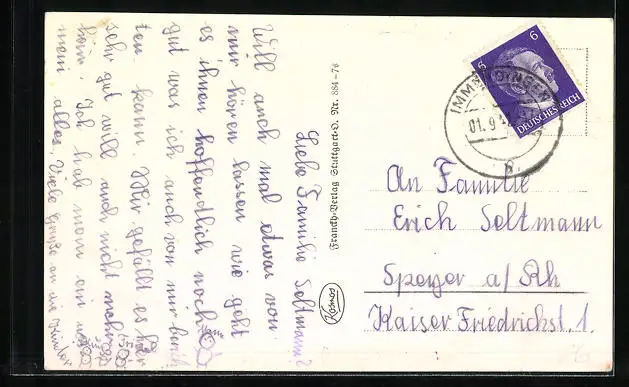 Personenbezogene Daten auf der Rückseite der Karte wurden durch blauen Textmarker unkenntlich gemacht. Die blauen Stellen sind auf die Vorderseite durchgeweicht und wirken sich negativ auf das Postkartenfoto aus