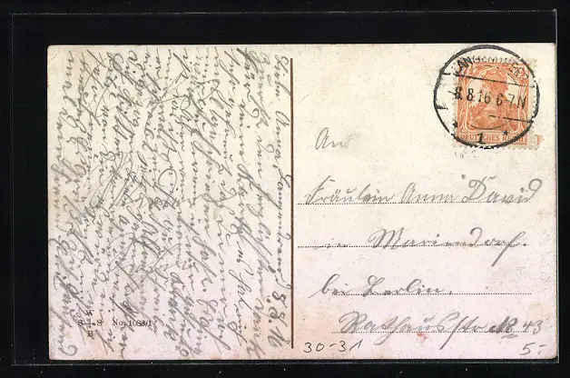 Personenbezogene Daten auf der Rückseite der Karte wurden durch blauen Textmarker unkenntlich gemacht. Die blauen Stellen sind auf die Vorderseite durchgeweicht und wirken sich negativ auf das Postkartenfoto aus