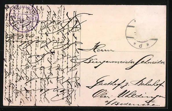 Personenbezogene Daten auf der Rückseite der Karte wurden durch blauen Textmarker unkenntlich gemacht. Die blauen Stellen sind auf die Vorderseite durchgeweicht und wirken sich negativ auf das Postkartenfoto aus