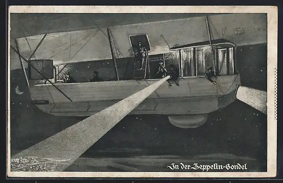 AK In der Zeppelin-Gondel, Luftschiffer mit Scheinwerfer