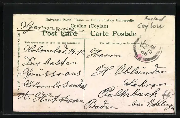 alte Ansichtskarte, gelaufen 1908, Briefmarke entfernt, guter Zustand