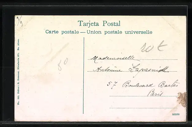 Personenbezogene Daten auf der Rückseite der Karte wurden durch blauen Textmarker unkenntlich gemacht. Die blauen Stellen sind auf die Vorderseite durchgeweicht und wirken sich negativ auf das Postkartenfoto aus