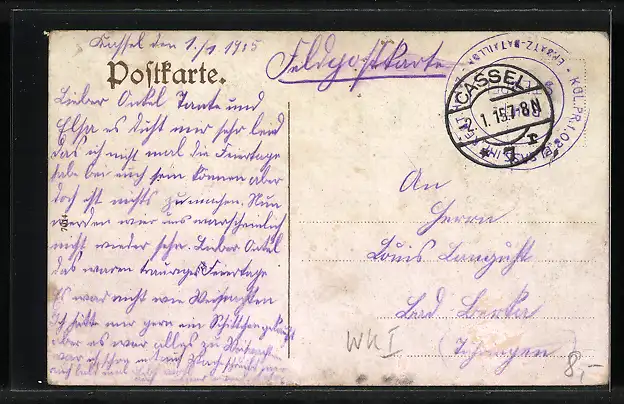 Personenbezogene Daten auf der Rückseite der Karte wurden durch blauen Textmarker unkenntlich gemacht. Die blauen Stellen sind auf die Vorderseite durchgeweicht und wirken sich negativ auf das Postkartenfoto aus