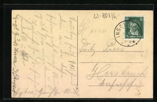 Personenbezogene Daten auf der Rückseite der Karte wurden durch blauen Textmarker unkenntlich gemacht. Die blauen Stellen sind auf die Vorderseite durchgeweicht und wirken sich negativ auf das Postkartenfoto aus