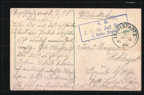 Personenbezogene Daten auf der Rückseite der Karte wurden durch blauen Textmarker unkenntlich gemacht. Die blauen Stellen sind auf die Vorderseite durchgeweicht und wirken sich negativ auf das Postkartenfoto aus