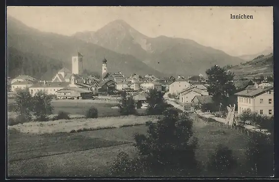 AK Innichen, Ortsansicht mit Gebirgspanorama