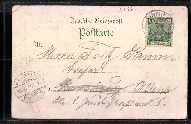 alte Ansichtskarte, gelaufen 1900, Eckknick oben re., Bugspur oben li., guter Zustand