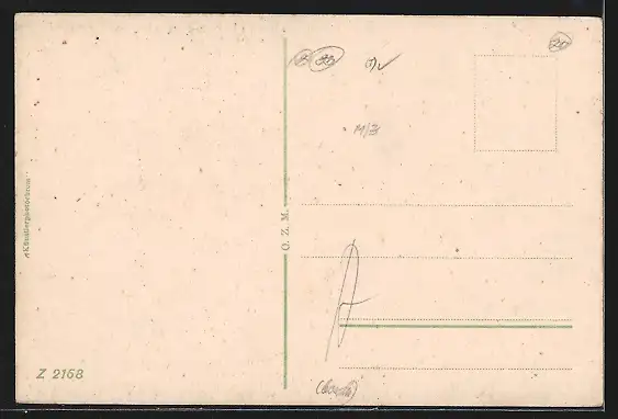 Personenbezogene Daten auf der Rückseite der Karte wurden durch blauen Textmarker unkenntlich gemacht. Die blauen Stellen sind auf die Vorderseite durchgeweicht und wirken sich negativ auf das Postkartenfoto aus