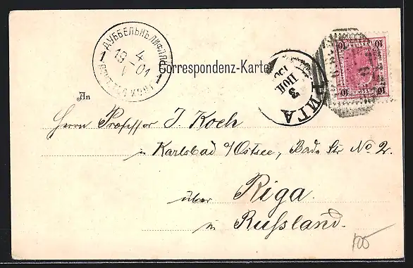 Personenbezogene Daten auf der Rückseite der Karte wurden durch blauen Textmarker unkenntlich gemacht. Die blauen Stellen sind auf die Vorderseite durchgeweicht und wirken sich negativ auf das Postkartenfoto aus