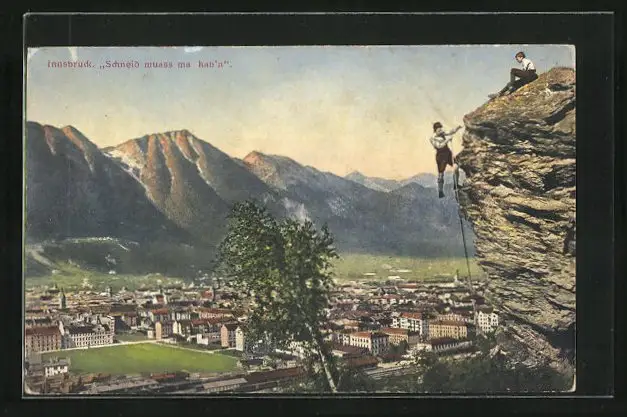 AK Innsbruck, Bergsteiger mit Stadt im Hintergrund