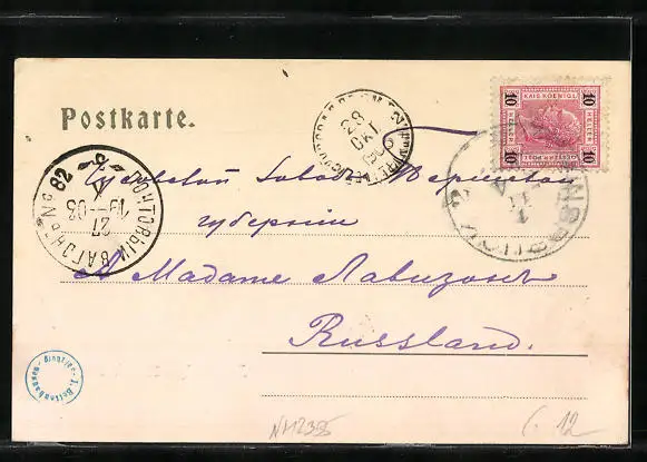 Personenbezogene Daten auf der Rückseite der Karte wurden durch blauen Textmarker unkenntlich gemacht. Die blauen Stellen sind auf die Vorderseite durchgeweicht und wirken sich negativ auf das Postkartenfoto aus