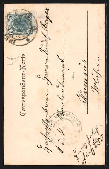 Personenbezogene Daten auf der Rückseite der Karte wurden durch blauen Textmarker unkenntlich gemacht. Die blauen Stellen sind auf die Vorderseite durchgeweicht und wirken sich negativ auf das Postkartenfoto aus