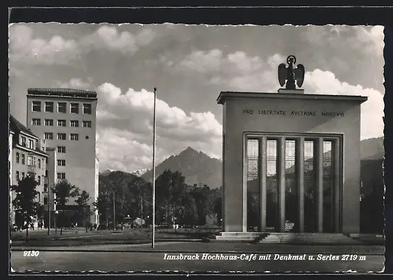 AK Innsbruck, Hochhaus-Cafè mit Denkmal und Serles