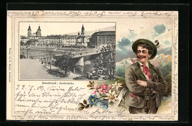 AK Innsbruck, Innbrücke, Mann in Tracht