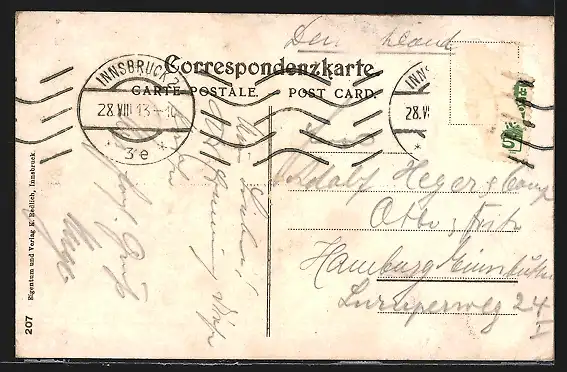 alte Ansichtskarte, gelaufen 1913, Briefmarke entfernt, rückseitig Oberflächenschaden, Eckknicke oben, guter Zustand