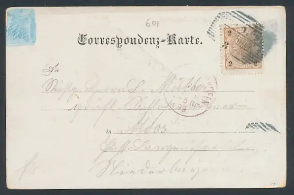 Personenbezogene Daten auf der Rückseite der Karte wurden durch blauen Textmarker unkenntlich gemacht. Die blauen Stellen sind auf die Vorderseite durchgeweicht und wirken sich negativ auf das Postkartenfoto aus