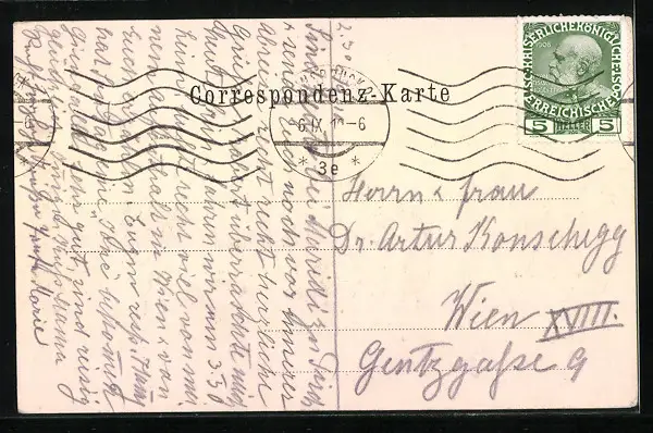 Personenbezogene Daten auf der Rückseite der Karte wurden durch blauen Textmarker unkenntlich gemacht. Die blauen Stellen sind auf die Vorderseite durchgeweicht und wirken sich negativ auf das Postkartenfoto aus