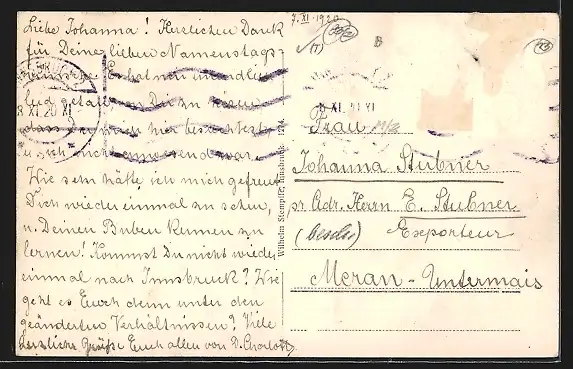 alte Ansichtskarte, gelaufen 1920, Briefmarke entfernt, rückseitig Oberflächenschaden, guter Zustand