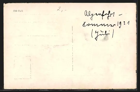 Personenbezogene Daten auf der Rückseite der Karte wurden durch blauen Textmarker unkenntlich gemacht. Die blauen Stellen sind auf die Vorderseite durchgeweicht und wirken sich negativ auf das Postkartenfoto aus